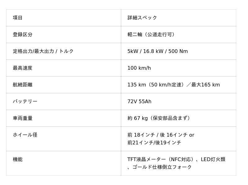 これまでオフロード競技専用であった圧倒的なパフォーマンスを、日本の公道で。車検不要な「軽二輪」区分でありながら、最高出力16.8kW、最大トルク500Nmという驚異的なスペックを誇り、静寂の中に爆発的な加速を秘めた新しいライディングライフを提案します。
