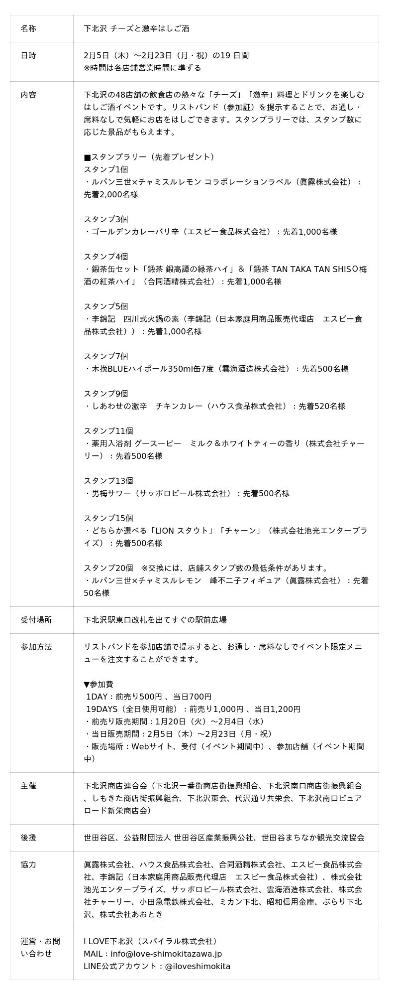 デジタルで未来最適をリードするスパイラル株式会社(東京都港区、代表取締役グループCEO 佐谷 宣昭)のまちおこしDXカンパニーは、下北沢商店連合会(会長 長沼 洋一郎)主催のもと、2026年2月5日(木)から2月23日(月・祝)までの19日間、熱々な「チーズ」と「激辛」をテーマにした限定メニューが堪能でき、また行きたくなるお店に出会えるはしご酒イベント「下北沢 チーズと激辛はしご酒」を開催いたします。