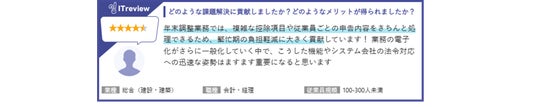 レビューでは、担当営業・SEの手厚いサポート、データの一元管理による経理担当者の業務負担軽減などが評価されています。