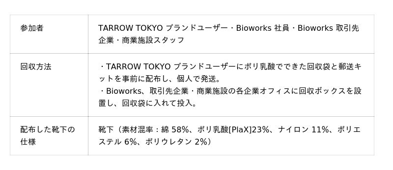 本プロジェクトでは 、株式会社グラックジャパン(本社:名古屋市中区、 取締役社長:由比康之)が運営する自社ブランド「TARROW TOKYO」と都内商業施設の2社協力のもと、PlaX を使用した靴下を消費者・事業者に配布し、一定期間ご使用いただいた上で回収。回収した靴下を用いたケミカルリサイクルの実証実験を行い、技術・コスト・環境負荷・ユーザビリティの観点から、新たな循環型ビジネスモデルの確立に向けて検証を行いました。