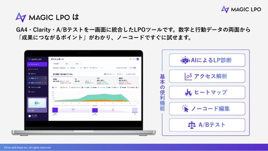 株式会社free web hope(本社:東京都渋谷区、代表取締役:相原 ゆうき)は、LP改善ツール「MAGIC LPO」において、A/Bテスト、ヒートマップ、AI診断、アクセス解析を含むすべての基本機能を無料で利用できる「Freeプラン」の提供を開始いたしました。