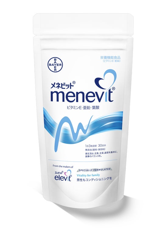 「メネビット(R)」は、プレナタル**サプリメント「エレビット(R)」シリーズから生まれた男性用サプリメントです。抗酸化作用を持つ栄養素として代表的なビタミンEや、コンディショニングに大切な細胞の代謝をサポートするミネラルの亜鉛など、男性の妊活を支える9つの栄養素をバランスよく配合したマルチビタミンサプリメントとなっています。