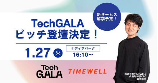株式会社TIMEWELL(本社:神奈川県横浜市、代表取締役:濱本隆太、以下「TIMEWELL」)は、2026年1月27日(火)~1月29日(木)に開催されるテクノロジーの祭典「TechGALA」にて実施される「TechGALAピッチパーク」に登壇し、ピッチを行うことが決定しましたのでお知らせいたします。