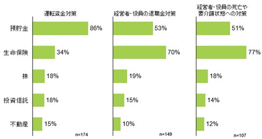 ●「運転資金対策」、「経営者・役員の退職金対策」、「経営者・役員の死亡や要介護状態への対策」が資金準備対象の上位