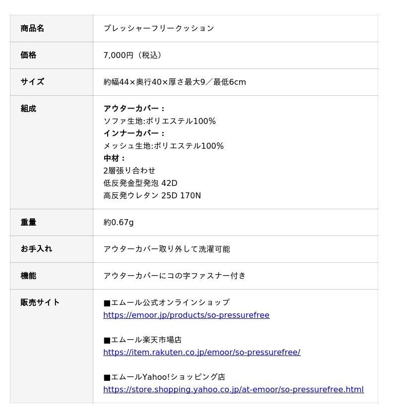 「身体に合った寝る・座る・たたむ」を提供する健康家具ブランドEMOORを展開する株式会社エムール(東京都立川市:代表取締役 高橋 幸司/以下、エムール)は、2026年1月19日より「プレッシャーフリークッション」の販売を開始しました。
