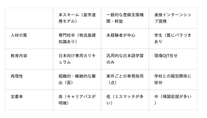 本取り組みは、既存の外国人材採用ルートと比較し、「教育の質」と「定着率」の観点で大きな優位性を持っています。
