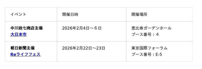 CHANTは今後、展示会・催事への出展を通じて、ブランドの世界観や実際の使い心地を直接体験いただける機会を広げてまいります。2月は、大日本市と朝日新聞主催のReライフフェスに出展致します。