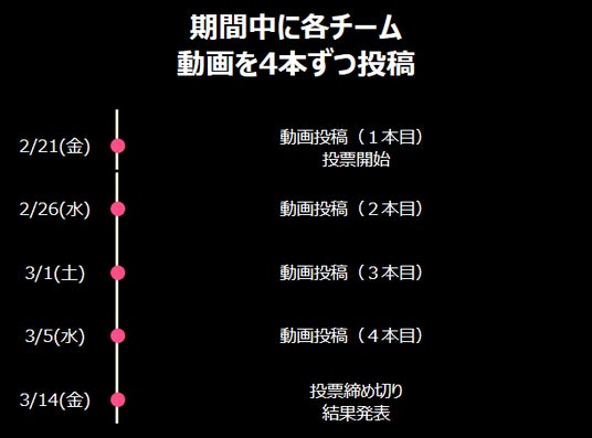 イベント開催期間中に各チームがそれぞれ動画を計4本投稿し、動画への合計「いいね」数を最も多く獲得したチームが優勝です。