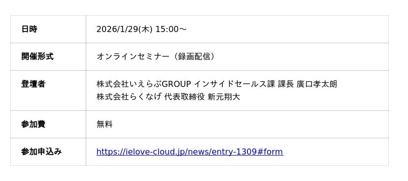 不動産業界特化のDX支援サービスを展開する、株式会社いえらぶGROUP(本社:東京都新宿区、代表取締役:岩名泰介、以下「いえらぶGROUP」)は、株式会社らくなげ(本社:東京都新宿区、代表取締役:新元翔大、以下「らくなげ」)と、1月29日(木)に録画配信(ライブ形式)にてセミナーを開催します。