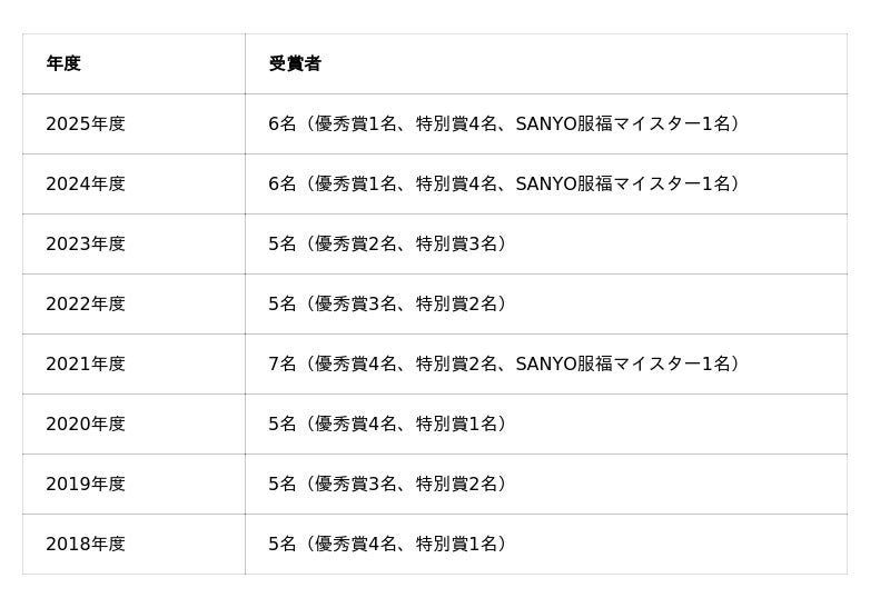 「SANYO服福賞」創設8年目を迎えた2025年度は、1,005点の応募作品の中から優秀賞1名、SANYO服福マイスター(※)1名、特別賞4名の計6名を選出。表彰式には4名、座談会には4名の受賞者がそれぞれ参加しました(うち3名は両方に出席)。