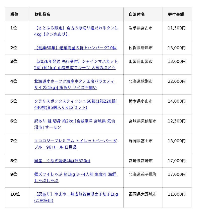 ふるさと納税ポータルサイト「さとふる」を運営する株式会社さとふる(本社:東京都中央区、代表取締役社長 兼 CEO:藤井 宏明)は、「さとふる」における2025年人気お礼品ランキング(確定版)(※1)を発表します。