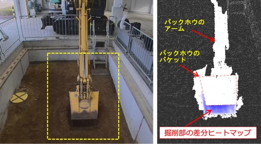 左キャプション:バックホウによる掘削状況 右キャプション:左写真における点線囲い部の拡大図。自動検出したバックホウの点群(白色)および掘削した部分の差分ヒートマップ表示(寒色系)を表している。バックホウの動きをリアルタイムで自動検出(右図ではバケットの位置が把握できている)するとともに、掘削部については掘削深さをリアルタイムに1cm単位でヒートマップ表示が可能