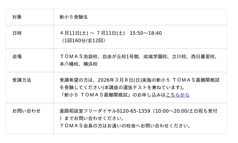 受講希望の方は、3月8日(日)実施の「新小5 TOMAS最難関模試」を受験してください。