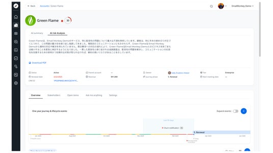 Staircase AIが企業のあらゆるチャネルにおける顧客インタラクション(メール、会議、チャット、CRMなど)を自動で解析します。同時に、Customer-Led Growth(顧客主導の成長)戦略のマーケットリーダーであるGainsightのベストプラクティスの基づいて設計された、事業機会を最大化させるための、数多くのインサイトがAIに組み込まれており、即座に変化を捉えて事業拡大機会のインサイトとアラートが生成されます。