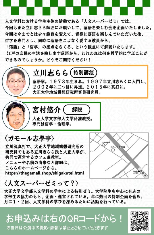 当日は、ガモール志學亭の店長を務める落語家の立川志らら氏と、哲学・倫理学を専門とする文学部人文学科の宮村悠介准教授が解説者となり、江戸の庶民の生活を映し出す「落語」と「哲学」の接点について学ぶことができます。
