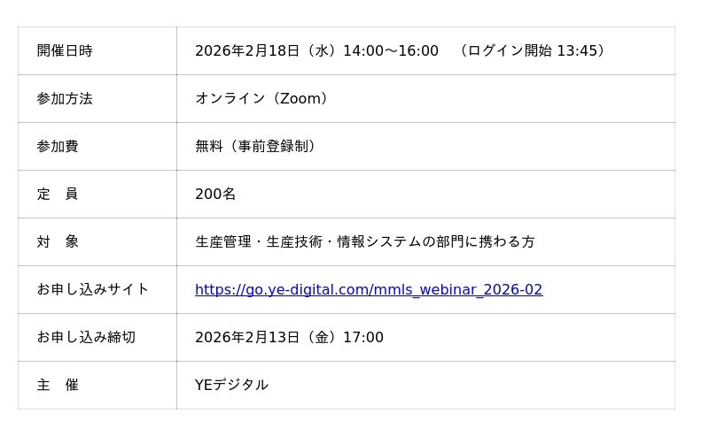 株式会社YE DIGITAL(本社:北九州市小倉北区、代表取締役社長:玉井裕治、以下、YEデジタル)は、製造現場における構内物流課題の解決に向けたオンラインセミナー 「製造業の現場課題をどう解決する? ~MES・WMS・WESのパッケージ連携で変わる構内物流~」 を、2026年2月18日(水)に開催します。