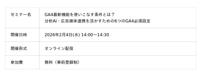 【2/4(水)開催 無料セミナー】GA4最新機能を使いこなす条件とは?分析AI・広告媒体連携を活かすための6つのGA4必須設定