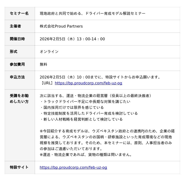 株式会社Proud Partners(本社:東京都新宿区、代表取締役:鈴木竜二)は、自動車運送業・物流企業の経営層を対象に、自動車運送業における特定技能人財の受け入れ・海外育成をテーマに、2026年2月5日(木)の13時~14時に、無料オンラインセミナー「現地政府と共同で始める、ドライバー育成モデル解説セミナー」を開催します。