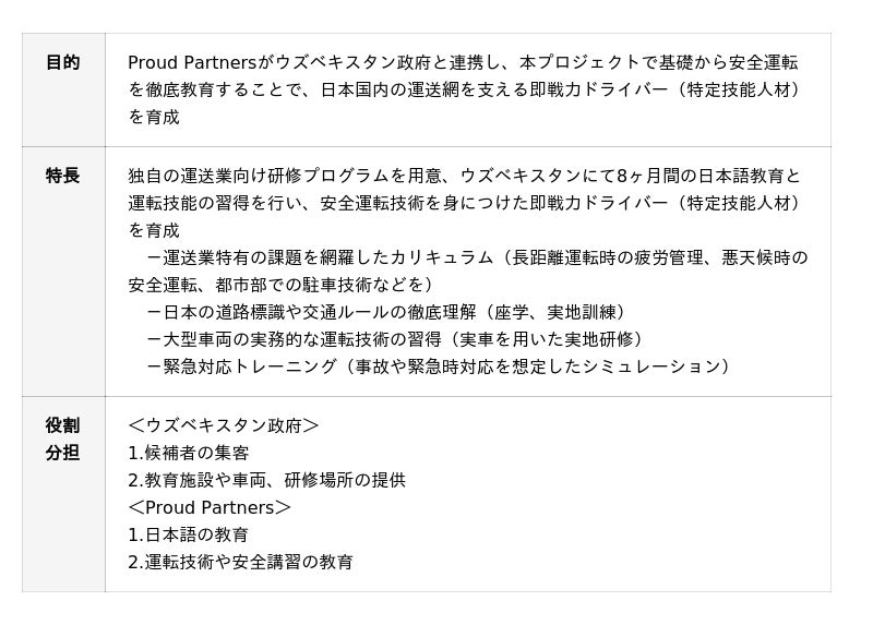 本プロジェクトは、ウズベキスタン政府と日本の交通ルールを前提とした安全運転を基礎から徹底教育することで、日本国内の運送網を支える即戦力を育成しています。