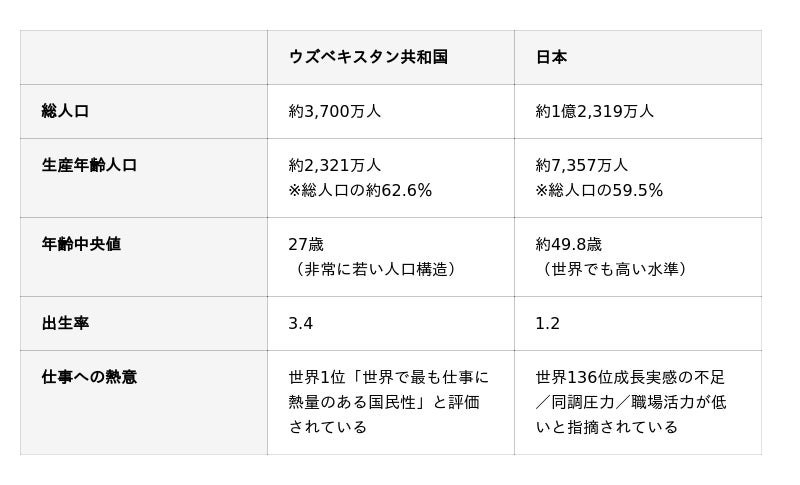 ウズベキスタン共和国は中央アジアに位置し、国民の年齢中央値が27歳と非常に若い人口構造で(図2を参照)、雇用機会の創出と同時に教育を通じた質の高い人財の輩出に努めています。最新の国際調査によれば、仕事への熱意ランキングで世界1位に輝き、「世界で最も仕事に熱量のある国民性」と評価されています。