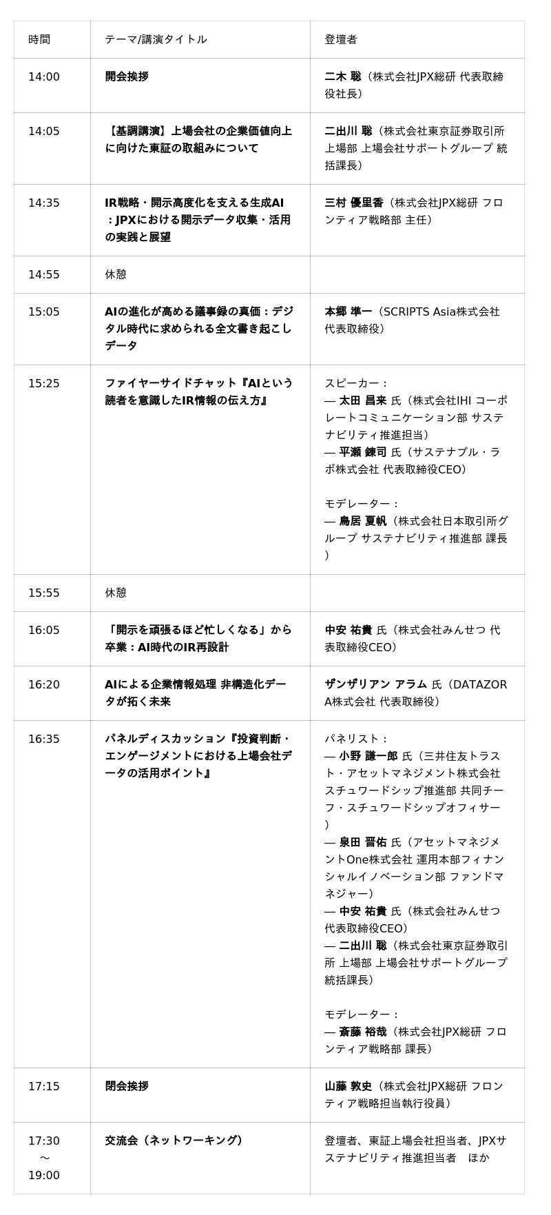 当イベントでは、投資家・サービス提供者の目線で、AI等のテクノロジーにより開示情報の利用にどう変化があったか(ありそうか)、また、テクノロジー・サービスの利用によってどういう業務効率化が期待できるかといった講演をさせていただき、より良い情報発信へのヒントを提供するとともに、投資家等の登壇者やJPXグループのメンバーとの交流/相談ができる機会を提供いたします。