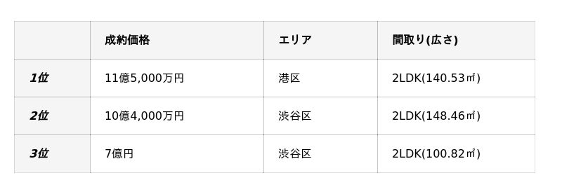 - 2025年:11億5,000万円(港区・2LDK・140.53平方メートル )