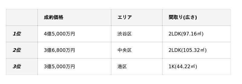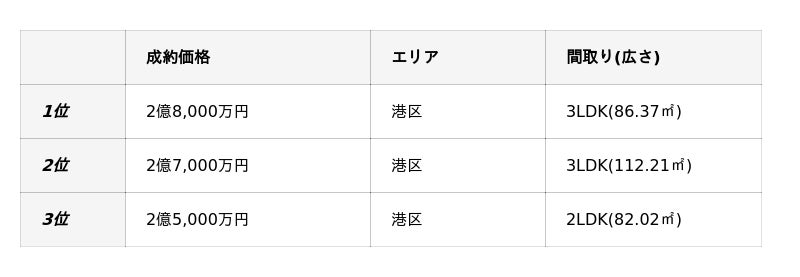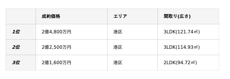 東京23区新築マンション成約価格事例TOP3