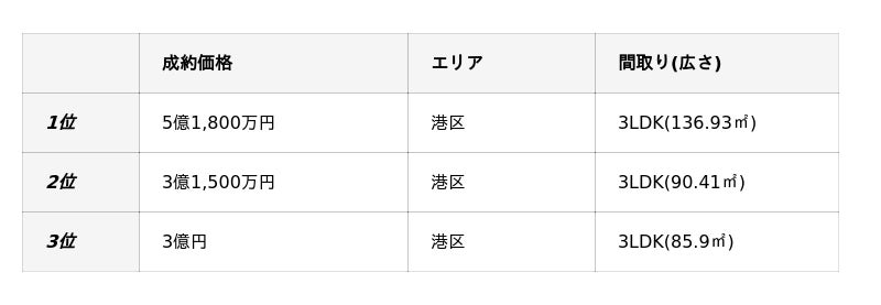 - 2023年:5億1,800万円(港区・3LDK・136.93平方メートル )