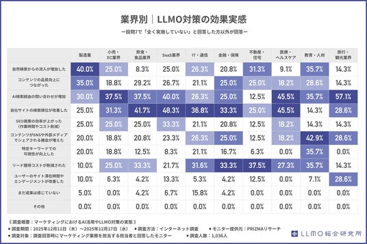 飲食・食品、教育・人材、旅行・観光といった業界では、「AI検索経由の問い合わせ増加」や「リード獲得コスト削減」が比較的高い
