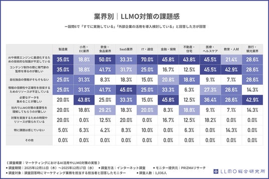特に飲食・食品、医療・ヘルスケア、教育・人材などでは、専門家監修や信頼性担保に関する課題が高く、LLMOに引用されやすい情報を発信したいという意識がある一方で、それを継続的に支える体制が整っていない実情がうかがえます。