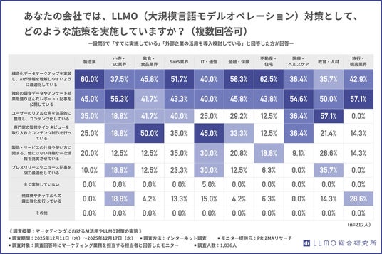 全体を通して見ると、業界ごとの違いはあるものの、LLMO対策はまだ「一部の先進的な施策」に集中しているというよりも、「自社が比較的取り組みやすい領域から着手している」段階にあるといえます。
