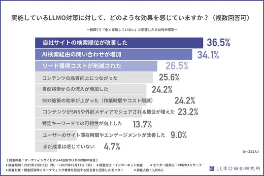 実際に対策を行っている企業では、検索順位の改善やAI検索経由の問い合わせ増加など、従来のSEOと重なる形で成果を実感しており、LLMO対策が新しい流入経路の開拓と既存施策の強化を同時に担っている様子がうかがえます。