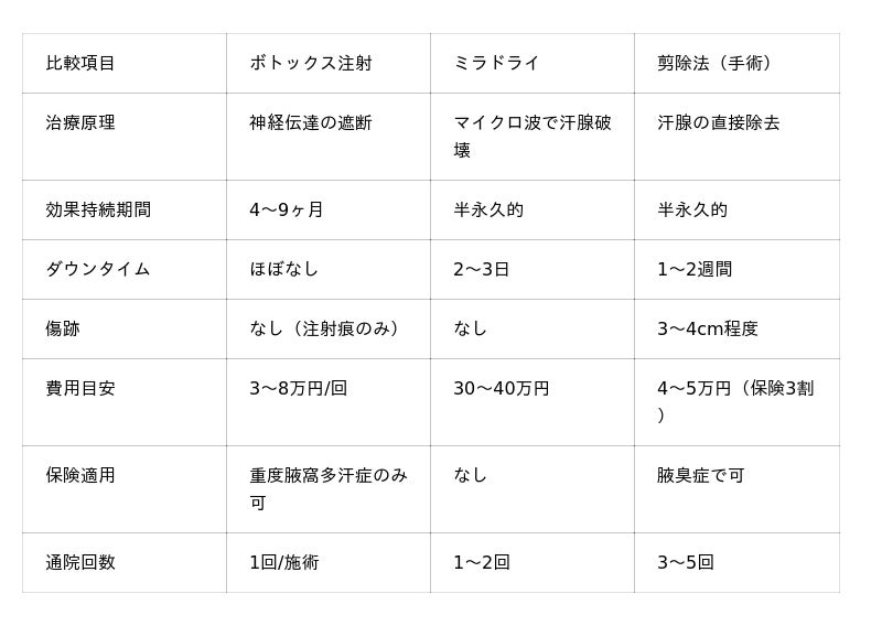 ボトックス注射は効果持続期間が4~9ヶ月のため定期的な再治療が必要ですが、ダウンタイムがほぼなく費用も1回あたり抑えられます。ミラドライは1回の治療で汗腺を破壊するため半永久的な効果が期待でき、傷跡も残りません。当院監修医師の2,000件以上の治療経験では、仕事で長期休暇が取れない方にはミラドライ、まずは効果を試したい方にはボトックスをお勧めしています。