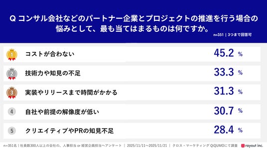 先述した調査でも、コンサル会社などのパートナー企業とプロジェクトの推進を行う場合の悩みとして、「コストが合わない」(45.2%)や「実施やリリースまで時間がかかる」(31.3%)が上位に挙がり、コストを抑えてしっかり推進してくれるパートナーの存在が求められていることが明らかになっています。