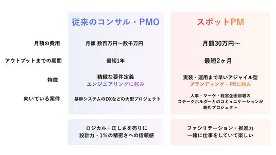 これまで、プロジェクト推進の外部支援といえば、大きく分けて「コンサルティング」や「PMO」が中心でした。