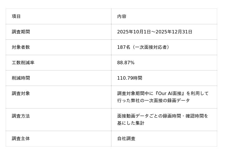 JetB株式会社(本社:東京都新宿区、代表取締役:竹内 勇人、以下JetB)は、自社開発のAI面接ツール『Our AI面接』を2025年10月から12月までの3ヶ月間実務に導入し、一次面接の工数削減効果の検証を行いました。187名の採用活動を実施した結果、従来と比較して88.87%の工数削減を達成し、AI面接の有用性を示しています。