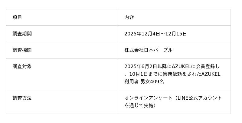 株式会社日本パープル(本社:東京都港区、代表取締役社長:林 壮之介)が運営する宅配型トランクルーム「AZUKEL(アズケル)」は、2025年12月、利用ユーザー409名を対象に「収納に関する意識調査」を実施しました。