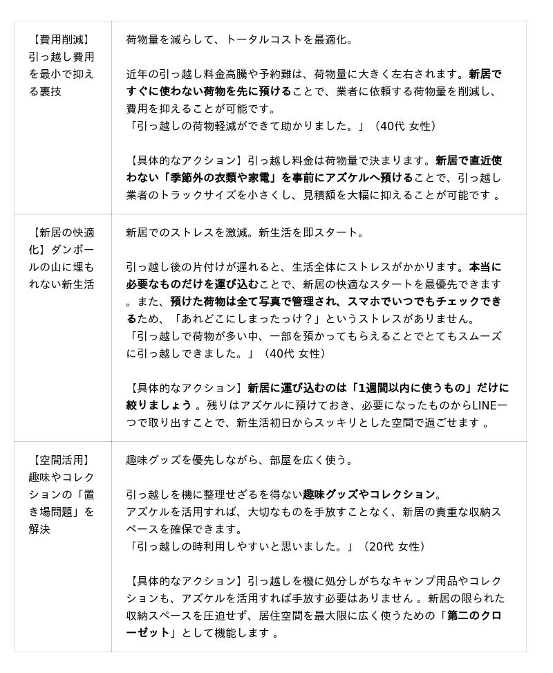 本リリースでは、調査結果とともに、新居を「モノの置き場」にせず、ゆとりある住空間でスムーズに新生活をスタートさせるためのアズケル活用術をご紹介します。
