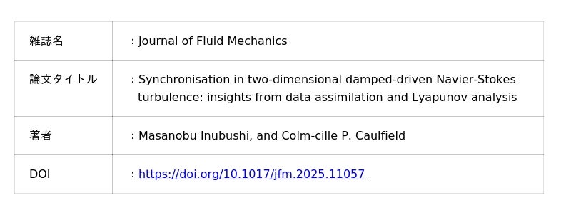 本研究成果は、2026年1月22日に国際学術誌「Journal of Fluid Mechanics」(ケンブリッジ大学出版)にオンライン掲載されました。