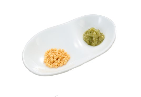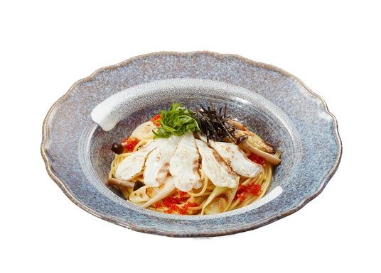 鯛塩ソースを使用した上品な塩味のパスタに、香ばしく炙った真鯛や、プチプチ食感のとびっこなどをトッピングした商品です。まずはそのまま、次に刻みわさびとあられをのせてアクセントをプラス。最後に真鯛の旨みが凝縮した鯛出汁をかけるとまろやかで滋味深い味わいに。1品で3度楽しめる贅沢な和風パスタをご賞味ください。