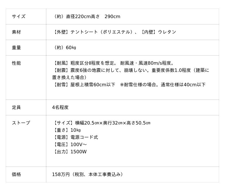 シンプルな工法で1棟あたりわずか数時間で設営可能なだけでなく、断熱性や耐久性に優れ、さらに耐震性や耐風性をあわせ持つことから、ワークスペースや宿泊スペース、避難所の医療救護室やコミュニティの休憩所、断熱を要する備蓄倉庫などにも活用できます。