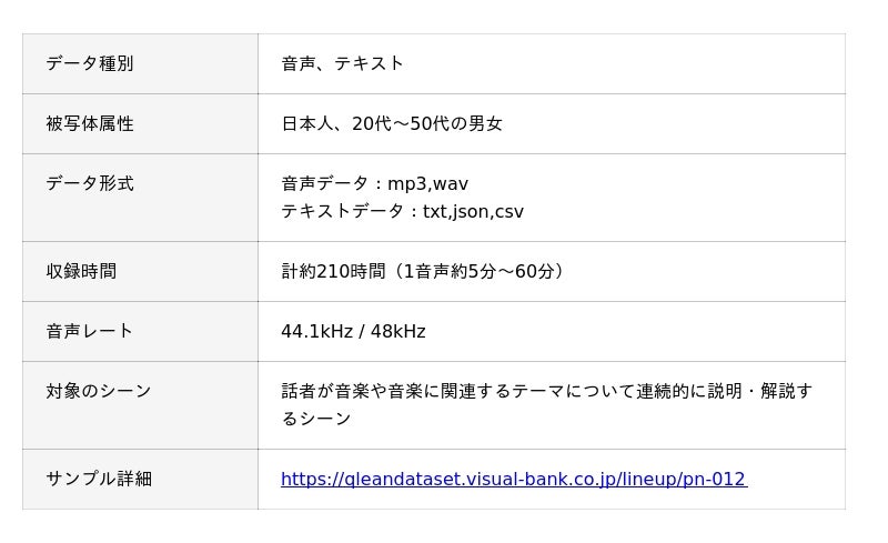 Visual Bank株式会社(東京都港区、代表取締役CEO 永井真之)は、傘下の株式会社アマナイメージズを通じて展開するAI学習用データソリューション「Qlean Dataset(キュリンデータセット)」において、ASR(自動音声認識)、NLP(自然言語処理)、LLM(大規模言語モデル)などの音声・言語系AI開発に向けた「日本語・1話者・音楽テーマトーク音声コーパスとトランスクリプト」の提供を開始しました。