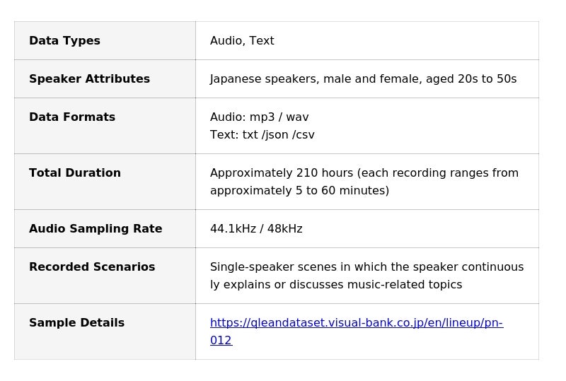 Qlean Datasetでは、研究用途から商用開発までを見据え、権利処理や利用条件を整理したAI開発用データを提供しています。本データセットもその一環として、音楽領域に関連する日本語音声・テキストデータを用いた検証環境の整備を目的に提供されます。