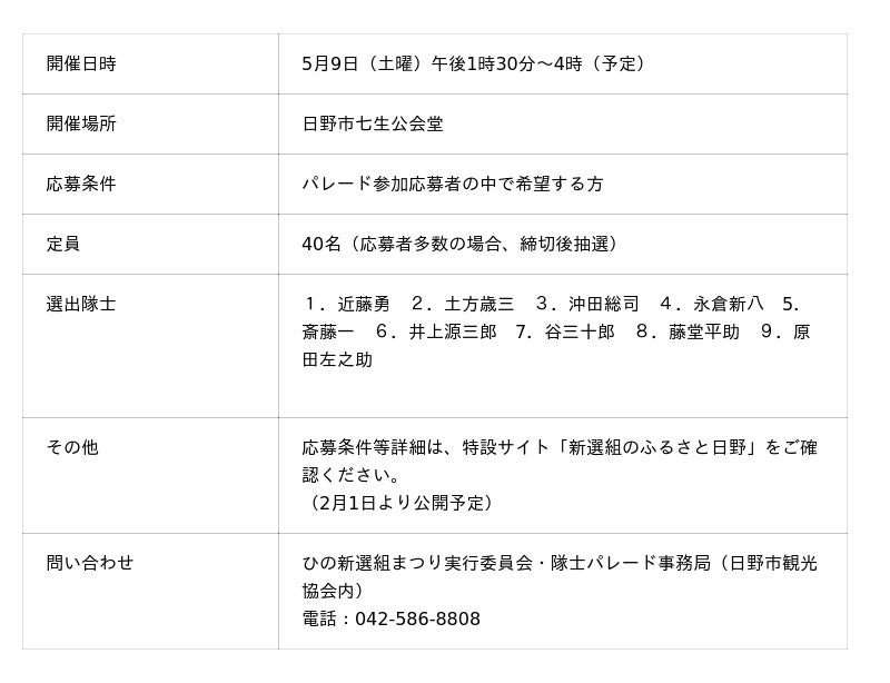 ひの新選組まつり実行委員会事務局・日野市産業振興課(電話:042-514-8437)企業プレスリリース詳細へ