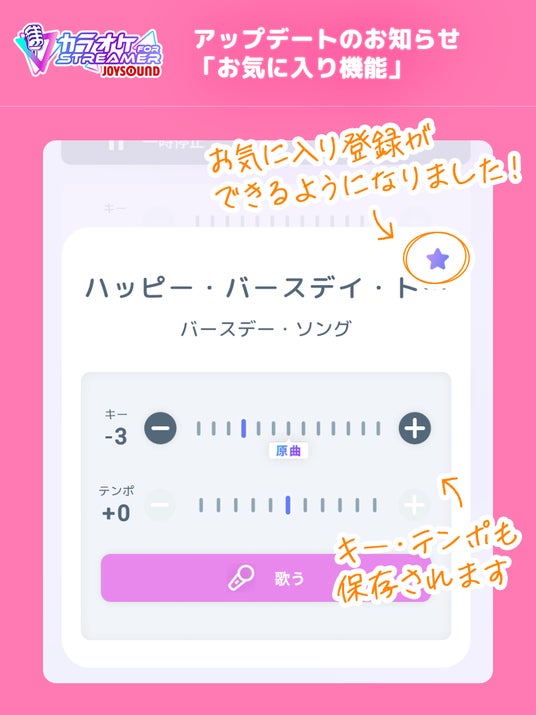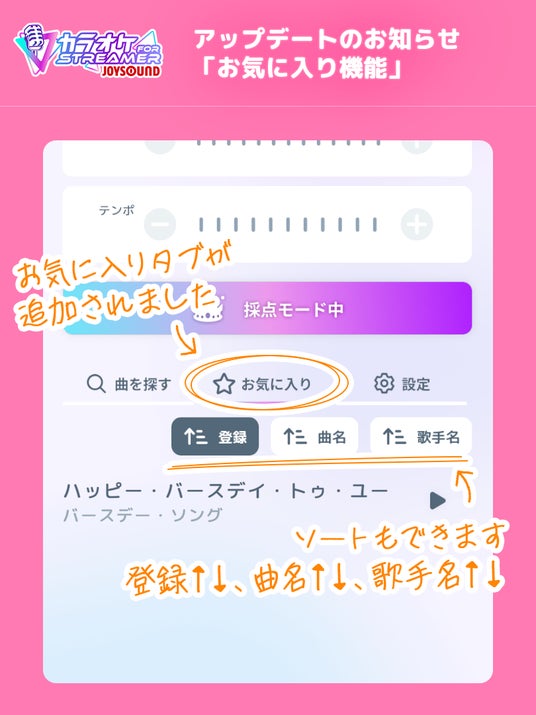 このほか、「カラオケJOYSOUND for STREAMER」では、配信での需要が高いボーカロイド楽曲をサービス開始時より3,500曲以上増曲し、さまざまなジャンルの楽曲を約4万曲(2025年3月現在)ご用意しております。さらに、今年2月にはバージョンアップを行い、「お気に入り機能」を実装することで、選曲の利便性を向上させるなど、配信者の皆さまの声に耳を傾け、日々の活動に寄り添えるサービスとして進化し続けてまいります。