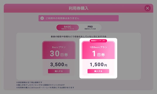 利用プラン:Basicプラン 趣味で配信をされる方へ:3,500円(税込)/30日