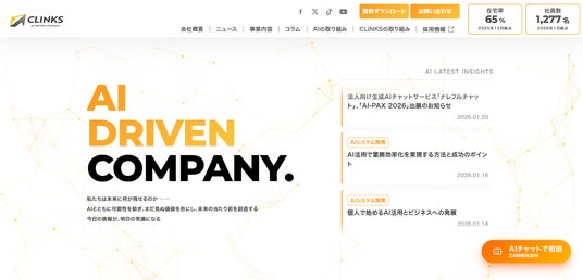 CLINKS株式会社(本社:東京都中央区、代表取締役:河原浩介)は、2026年1月26日(月) 、コーポレートサイトのTOPページを全面刷新したことを発表しました。あわせて、AI活用戦略の全容を公開する「AIの取り組み」ページを開設。 1,030名のAI資格取得や開発業務効率200%向上など、自社実践で得た具体的成果とノウハウを体系化し、企業のAI導入支援事業を本格展開することを明らかにしました。