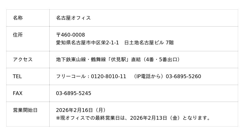 日本パレットレンタル株式会社(代表取締役社長:二村篤志、本社:東京都千代田区、以下JPR)は、物流の要衝である中部エリアにおいて、サービス提供体制の基盤強化を図り、お客さま満足度のさらなる向上を目指すため、2026年2月16日(月)より、名古屋オフィスを移転いたします。