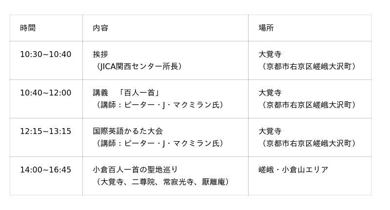 ピーター・J・マクミラン氏は、百人一首や万葉集などの英訳を行い、その歴史・文化的背景も含めて国内外に積極的に発信されています。今回講師にお迎えし、JICA留学生らに向けて百人一首とその背景にある日本人の心情や日本の風景などをお話しいただくとともに、参加者全員で、英語版百人一首かるたWHACK A WAKAの競技にもチャレンジします。