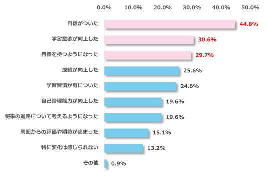 資格・検定を取得している子どもを持つ保護者317名を対象に、 子どもが資格・検定取得後の子どもの変化について調査しました。その結果、最多回答は「自信がついた(44.8%)」、次いで「学習意欲が向上した(30.6%)」、「目標を持つようになった(29.7%)」という結果になりました。